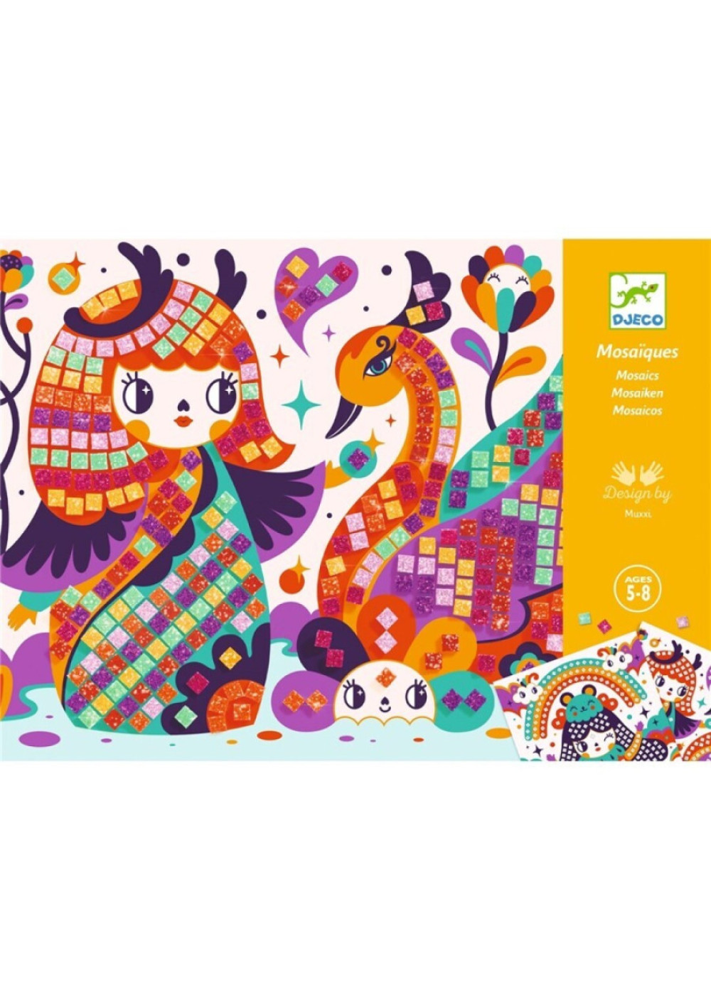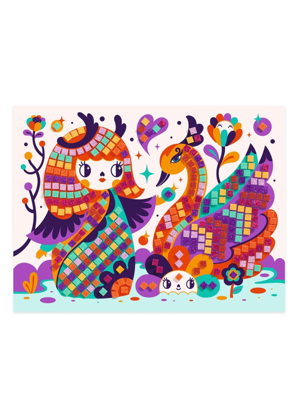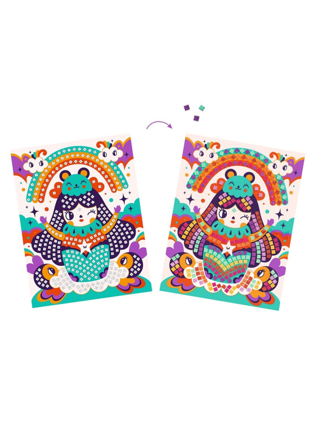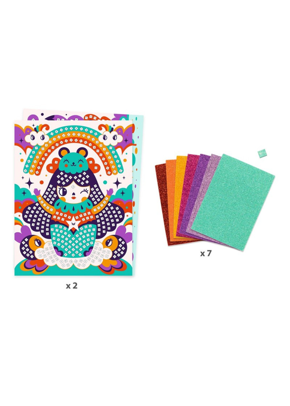 -Una actividad de pegado para crear imágenes con mosaicos. Para que los kokeshis resplandezcan, el niño completa los cuadros con los cuadraditos de espuma adhesiva con purpurina siguiendo paso a paso las instrucciones del cuadernillo.