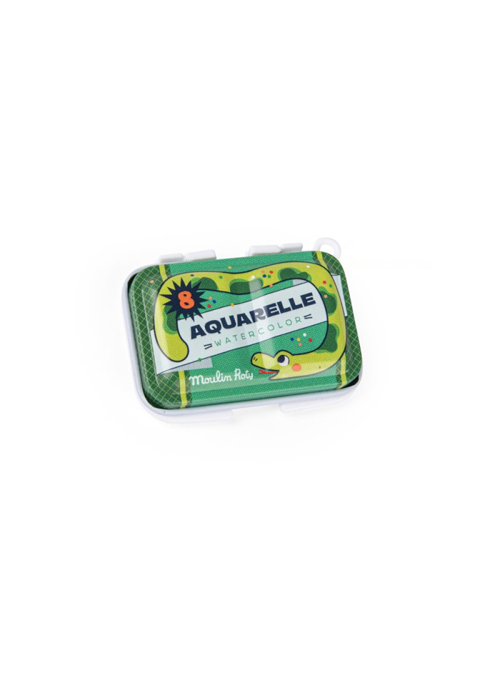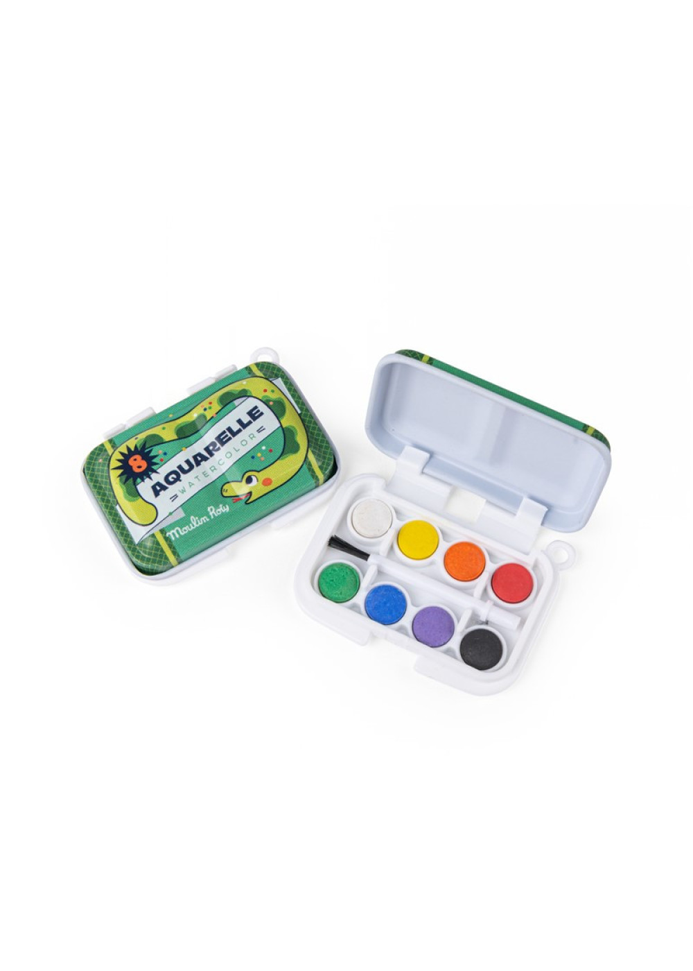 Cada mini paleta (6 × 4,4 cm) contiene ocho colores vivos y un pincel infantil