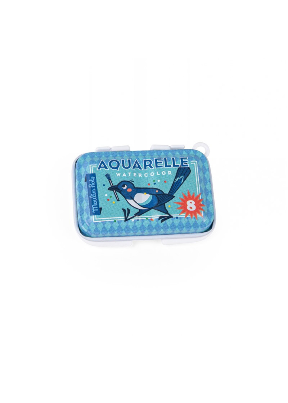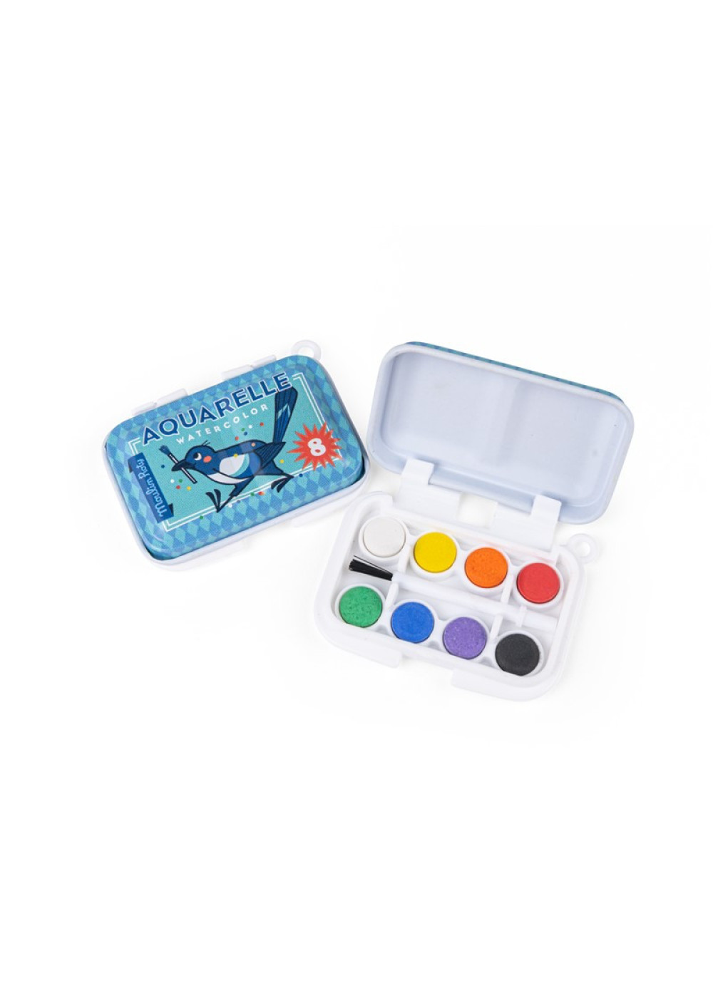 Cada mini paleta (6 × 4,4 cm) contiene ocho colores vivos y un pincel infantil