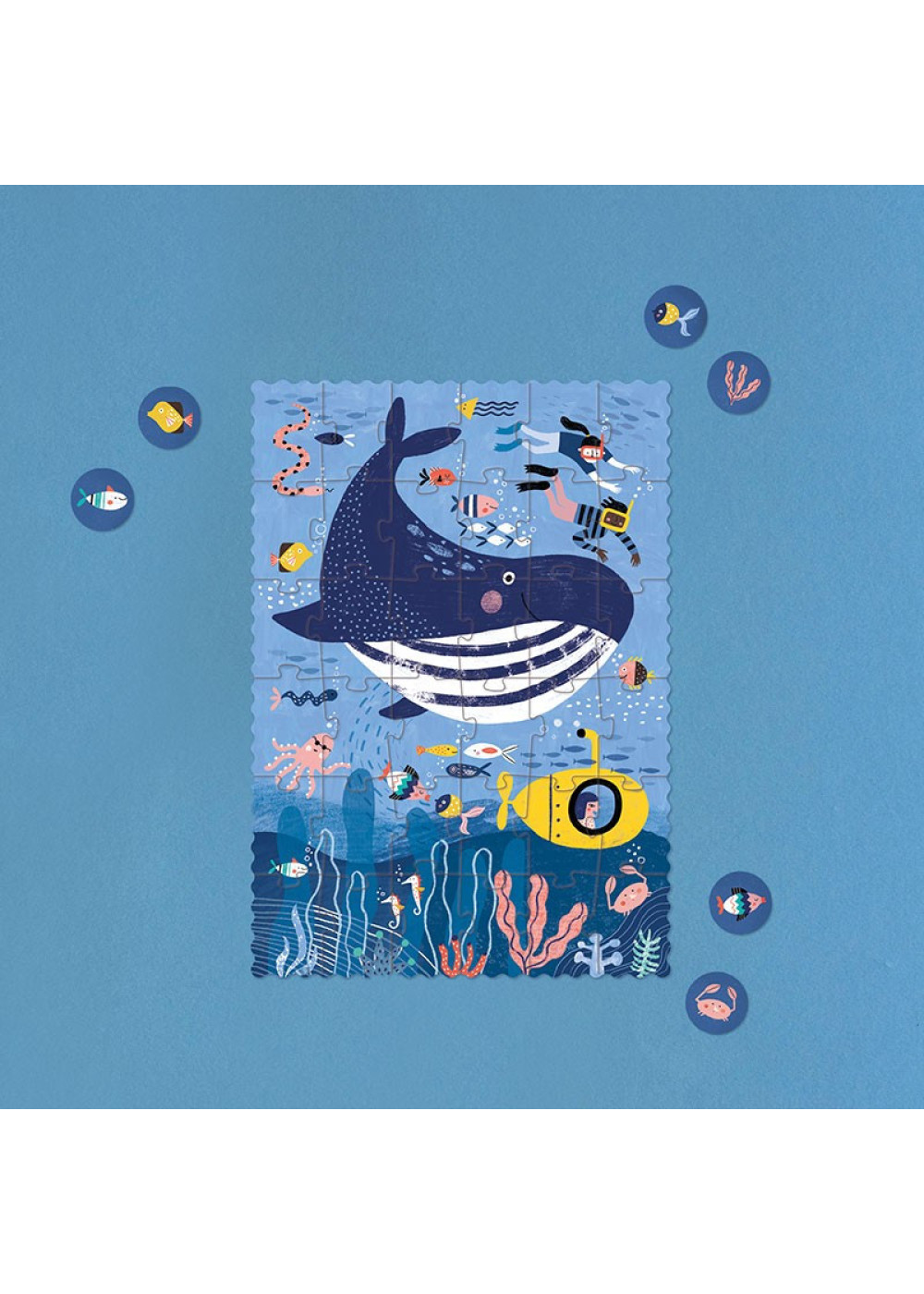 Un puzzle pequeño de 36 piezas que incluye 12 fichas de observación sobre el océano. Un juguete educativo y sostenible. De formato bolsillo, ideal para viajes