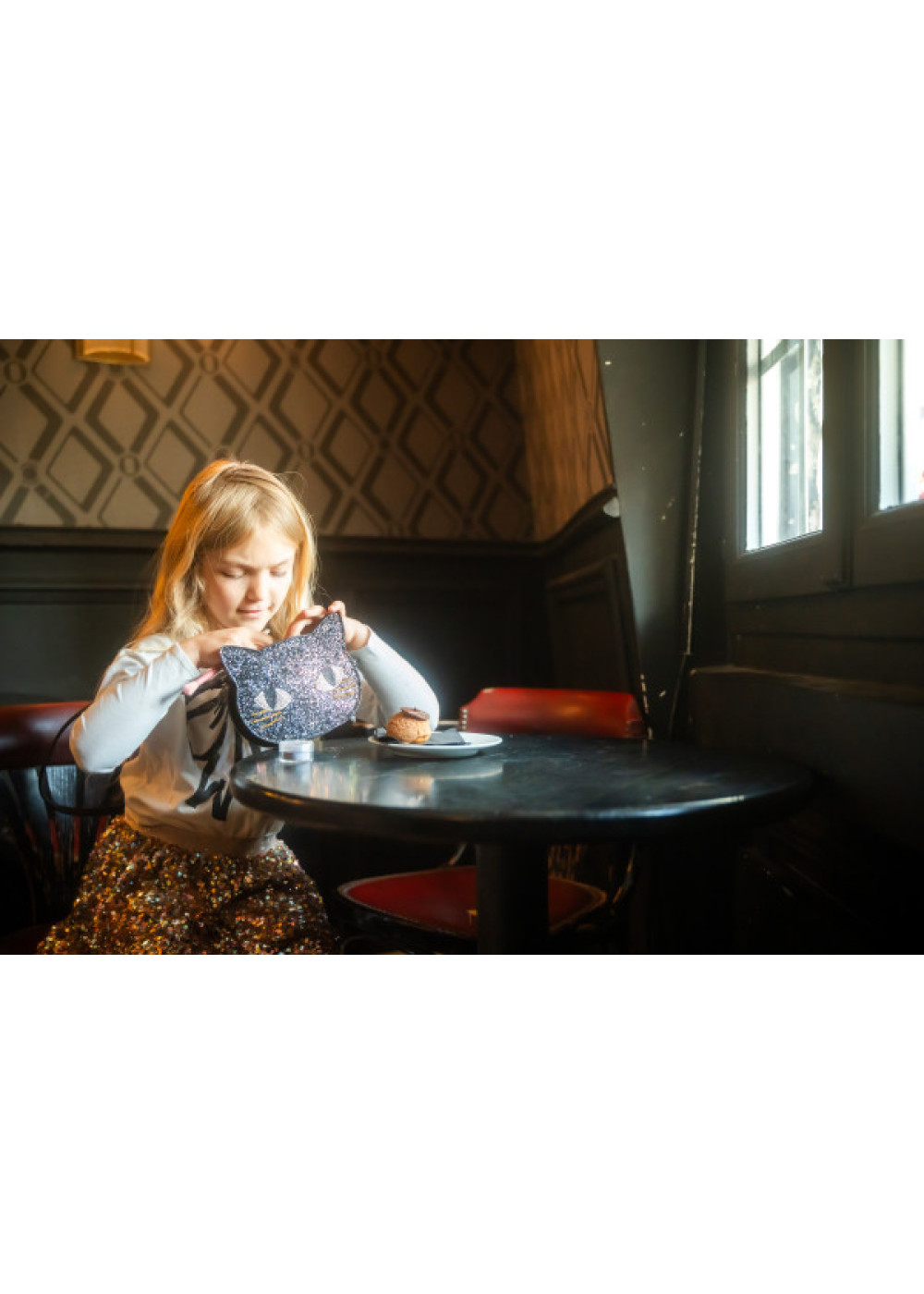 Bolso pequeño negro con glitter grueso y un diseño adorable de gatito, ideal para niñas que buscan un accesorio con mucha personalidad y brillo. Perfecto para guardar pequeñas pertenencias con estilo