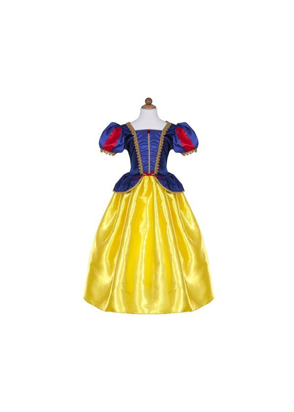 Vestido de lujo de Blancanieves, con los colores icónicos (azul, amarillo y rojo) y un diseño de cuento de hadas detallado, disponible en la talla 5-6.
