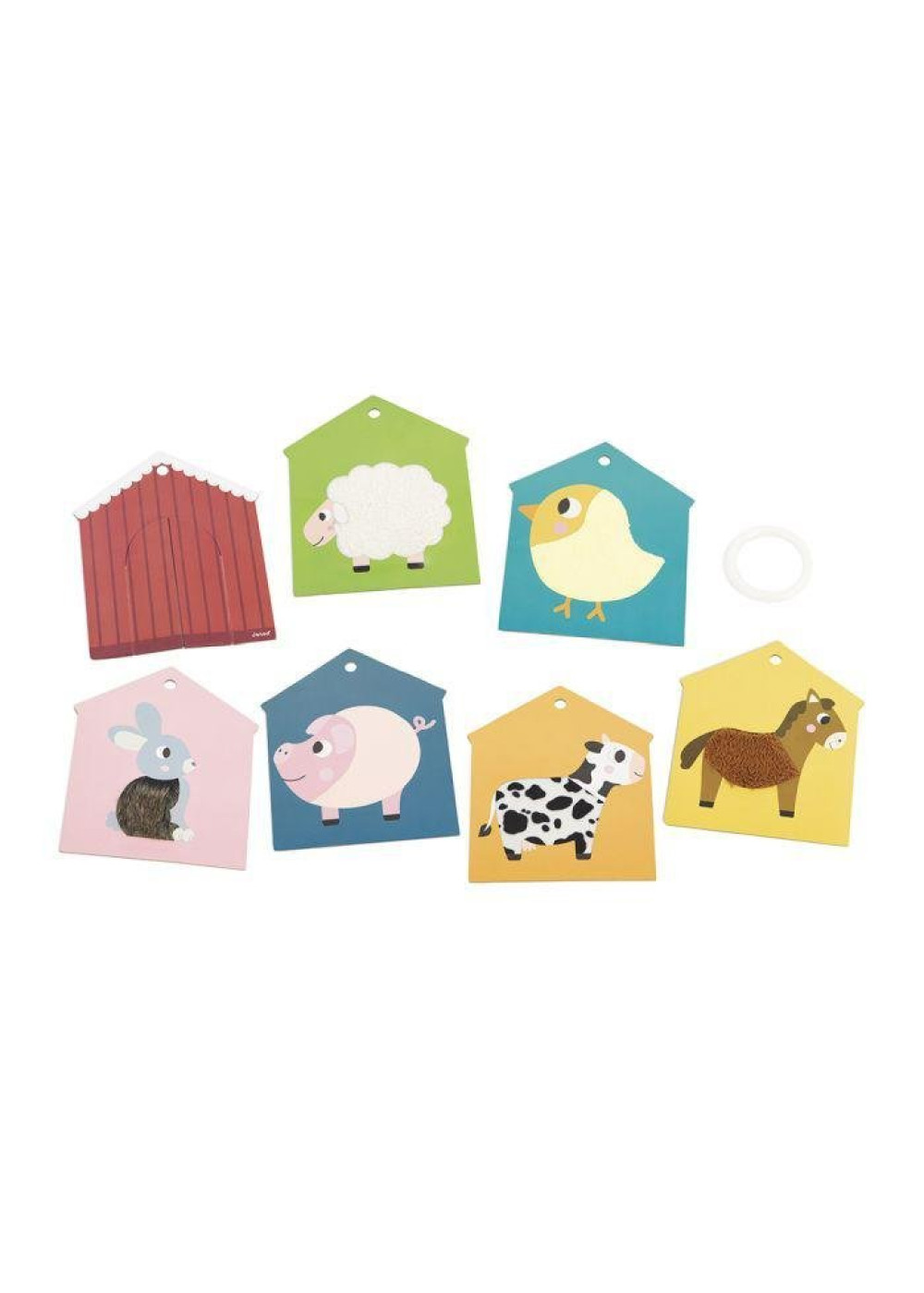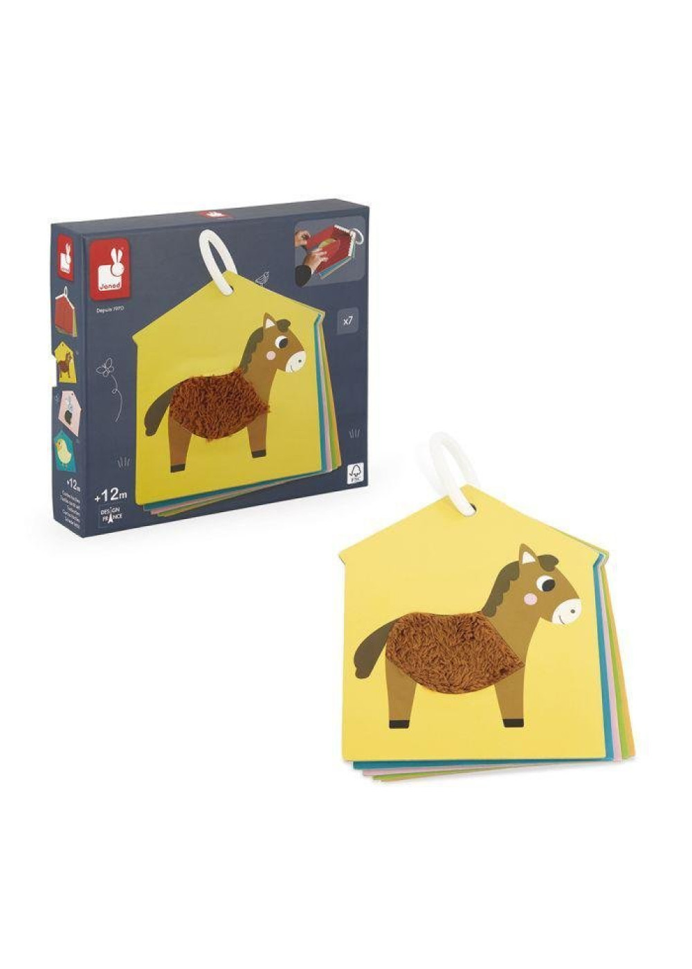 ¡A conocer a los animales de la granja! Al abrir las puertas de la granja, el niño descubrirá una de las 6 cartas texturizadas sobre los animales de la granja. ¿Cuál es el más suave? ¿La vaca o el conejo? Este juguete de estímulo es ideal para desarrollar el sentido del tacto. También es muy práctico para llevárselo a todas partes gracias a su anilla de plástico. Juguete de cartón FSCTM. Juguete de estímulo para niños a partir de 12 meses.