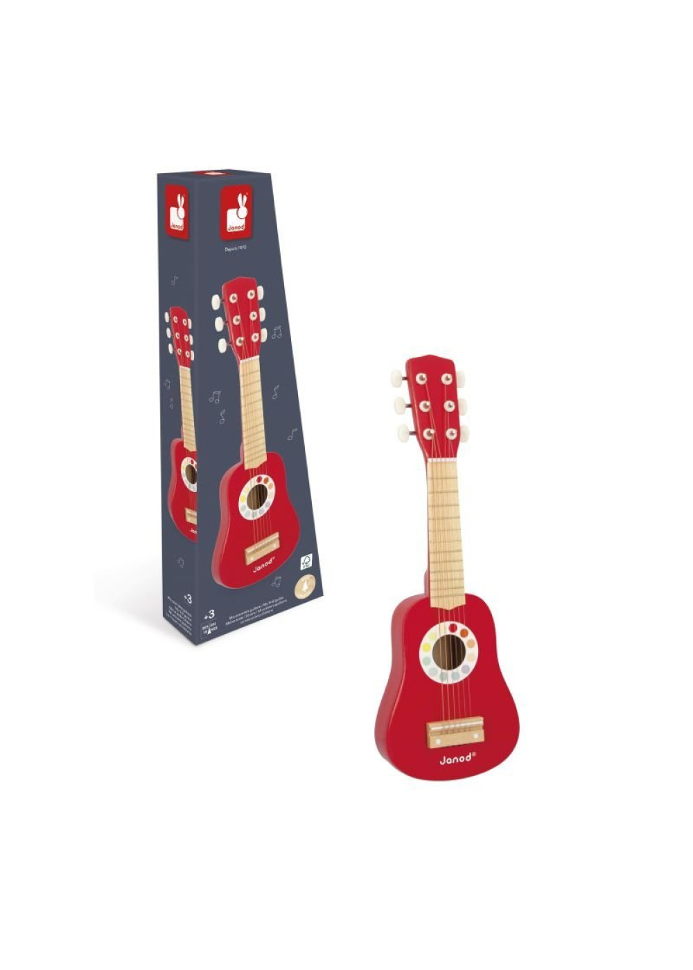 ¡Descubre el placer de la música con esta guitarra de madera con colores vivos! Con 6 cuerdas y 6 clavijas de afinación, es perfecto para dar sus primeros pasos en la música de forma fácil y divertida. Este juguete estimula la creatividad, la coordinación y la expresión musical. Juguete de imitación musical de madera certificada FSCT. Para niños a partir de 3 años.