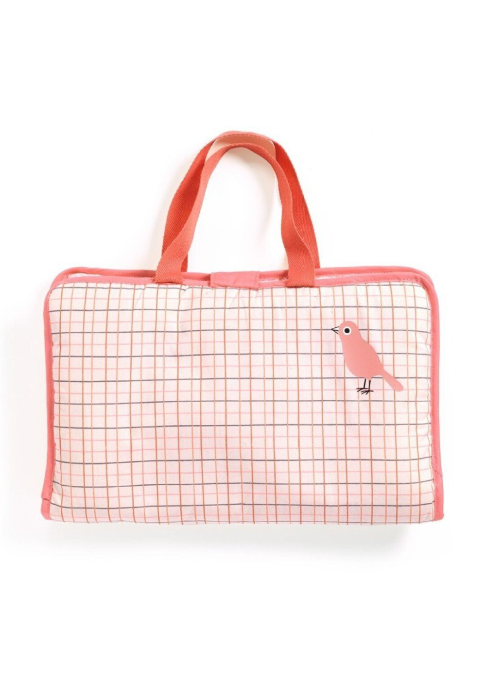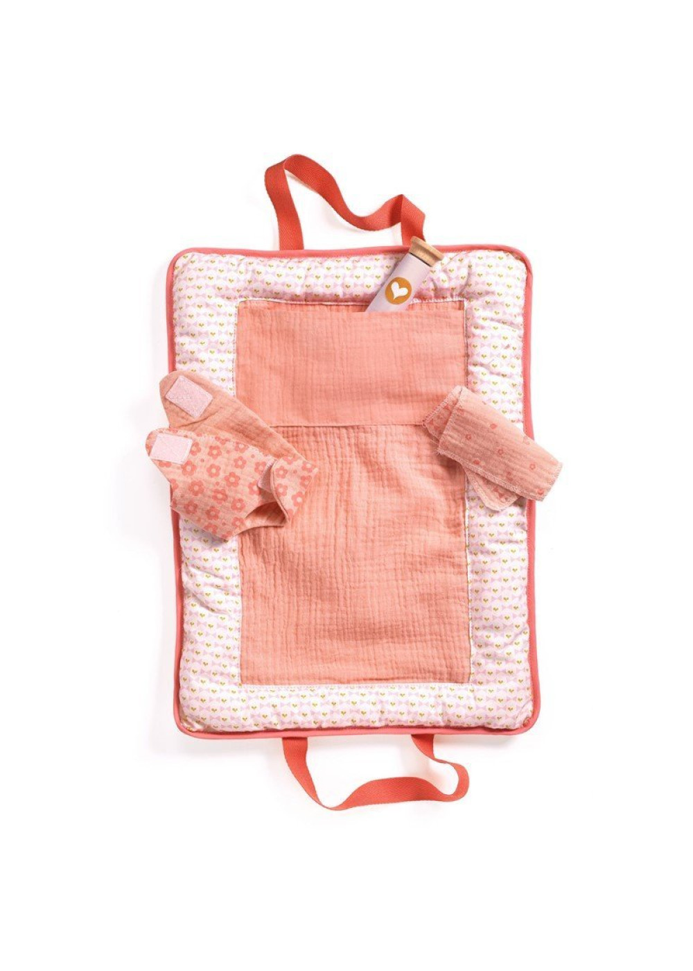-Una bolsa cambiador portátil para cambiar el pañal de tu bebé. Una vez abierta, se transforma en un cómodo colchón para tumbar al bebé. Con el pañal, las toallitas y el tubo de crema, el bebé tendrá el culito limpio. ¡Un accesorio imprescindible para llevar a todas partes!