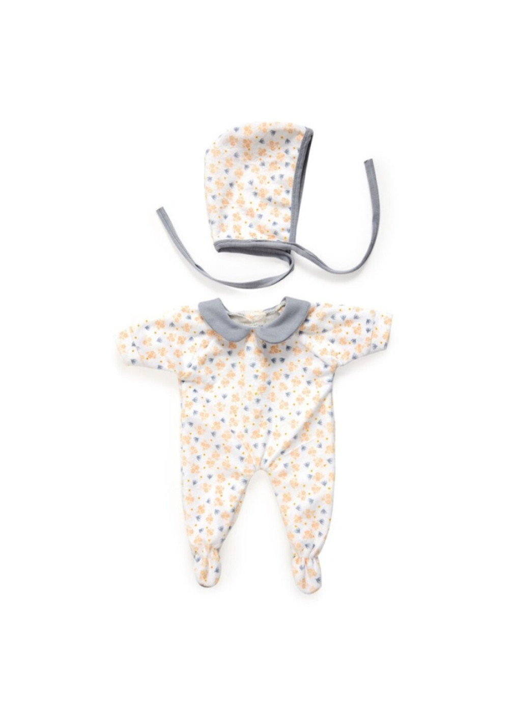 Este conjunto Paloma incluye un pijama de terciopelo suave, de una sola pieza, acompañado de su gorra a juego. Pensado para muñecas de 28-34 cm de la colección Baby Pomea, este pijama se abre y cierra con velcro, facilitando que los más pequeños puedan vestirlo sin ayuda. Ideal para niños a partir de 18 meses, puede lavarse a máquina a 30 °C. Dimensiones compactas y diseño adorable, perfecto para completar el armario de la muñeca con comodidad y ternura.
