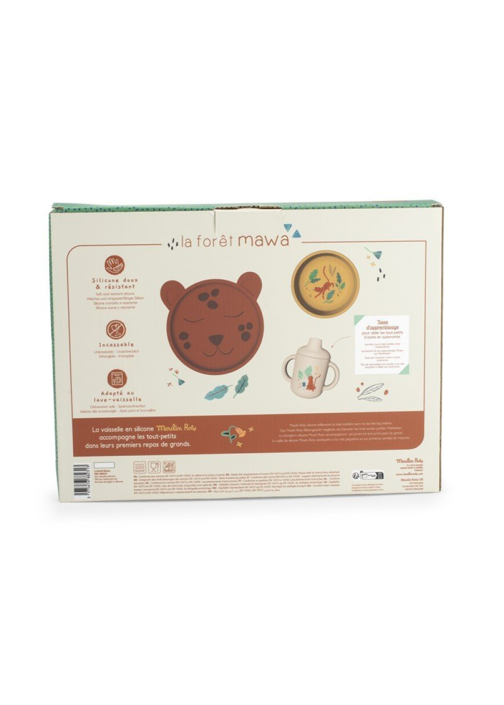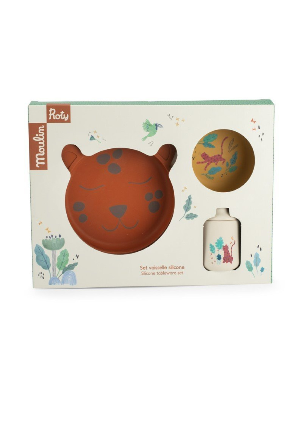 Set de vajilla de silicona que inluye un plato, un cuenco y un vasito de aprendizaje.