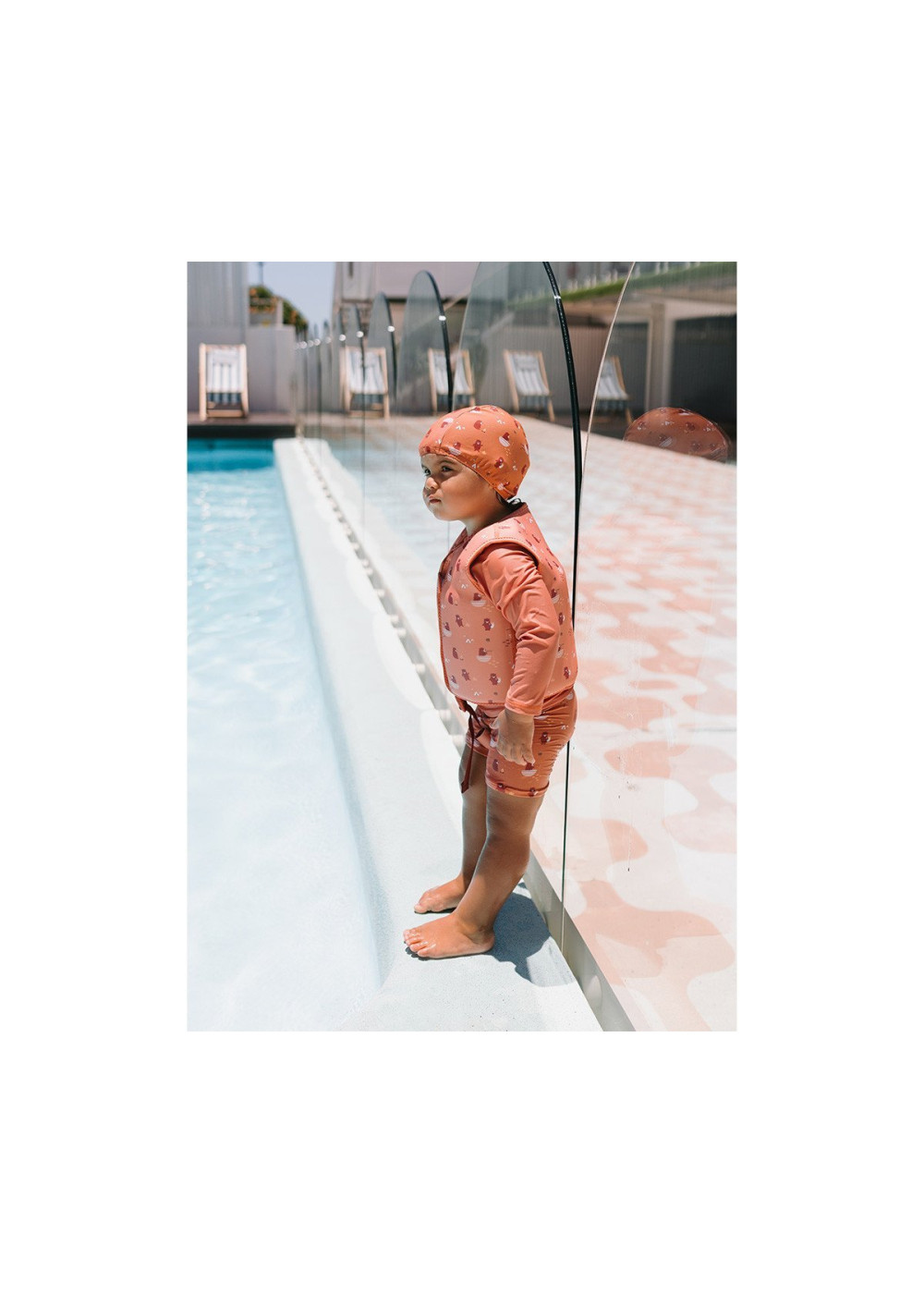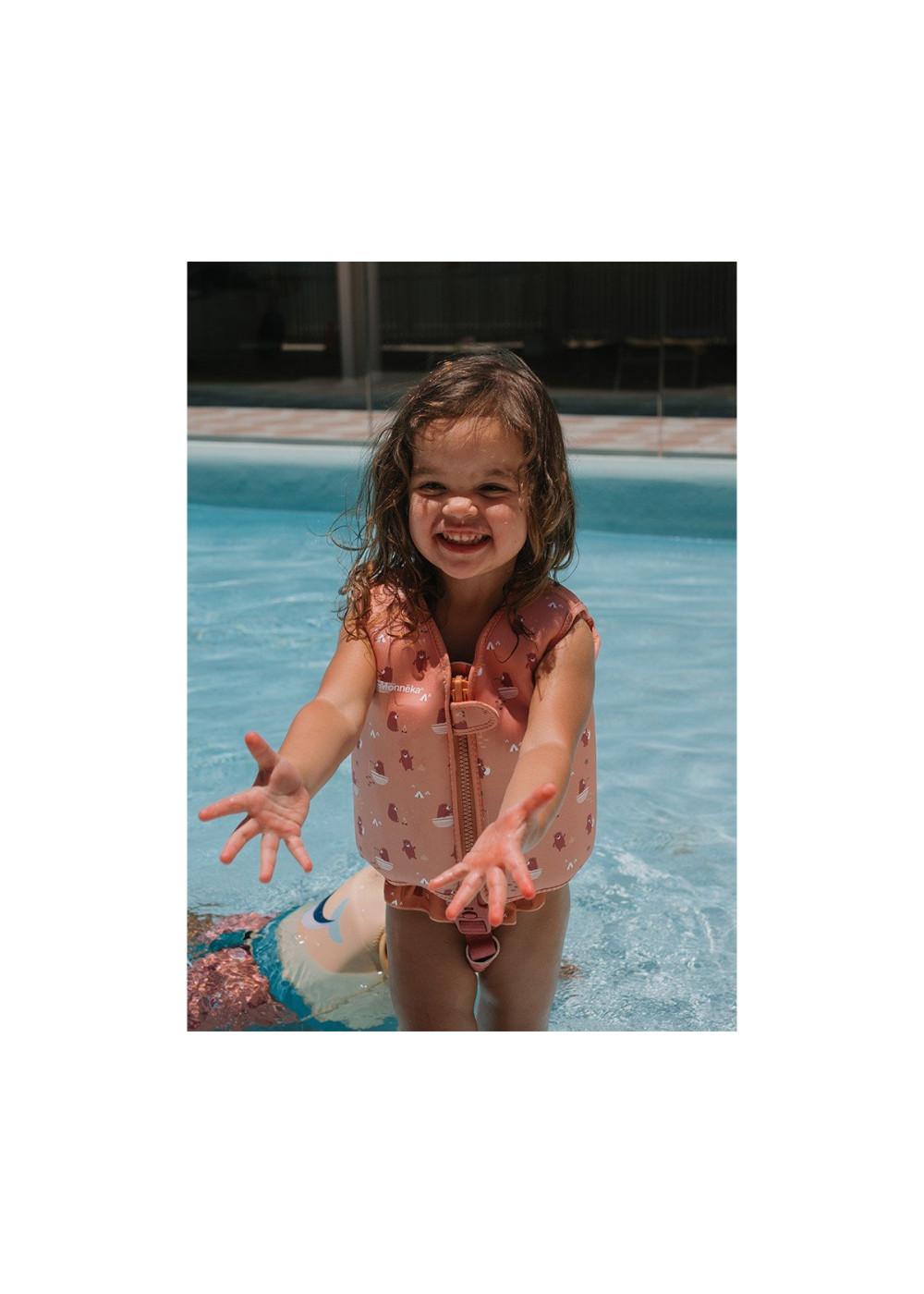 Además cuenta con una cinta ajustable con cierre de seguridad que se coloca entre las piernas, impidiendo que el chaleco se desplace hacia arriba cuando el niño se lanza al agua o simplemente flota. Además, la cinta está protegida con neopreno suave para evitar rozaduras.