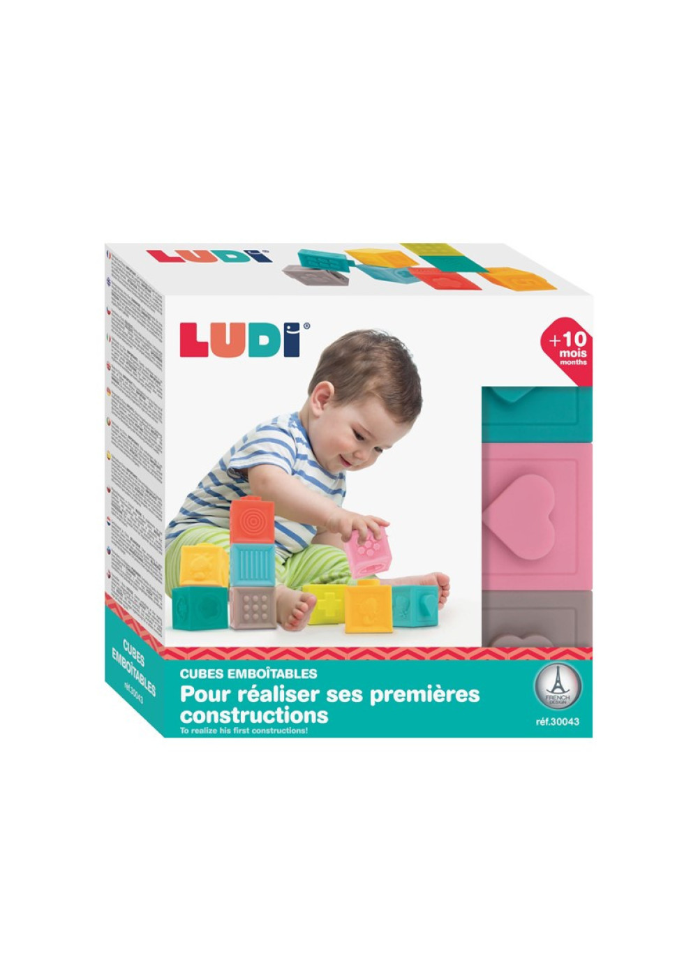Los cubos son fáciles de manipular. Cuando le pellizcan, un ruidito divertido atrae la atención del bebé. De esta forma los niños ejercitan su flexibilidad y capacidad de prensión, así como su concentración para apilar. Este primer juego de construcción desarrolla la destreza, la motricidad, la agudeza visual y la paciencia.