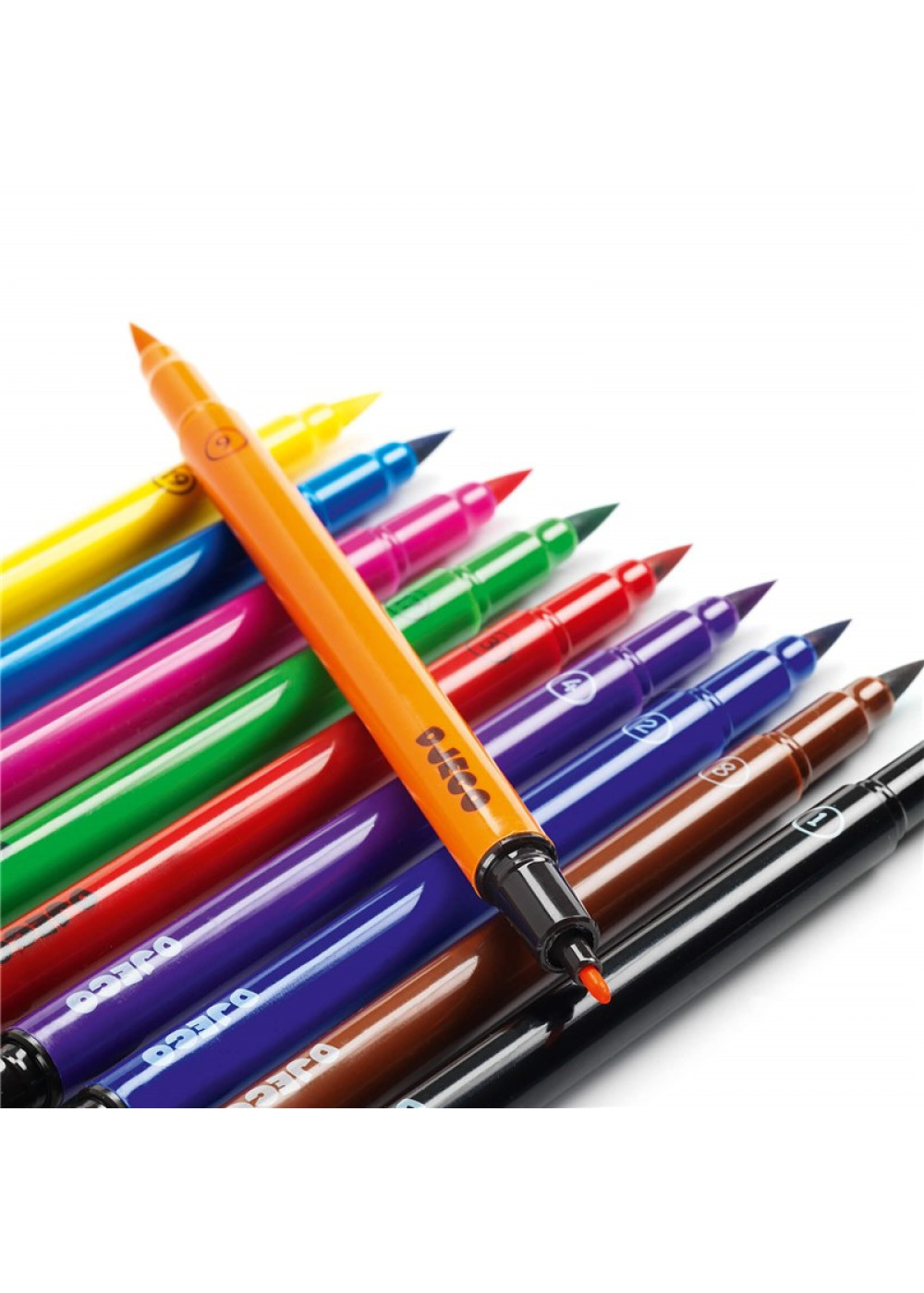Contenido: 10 rotuladores de doble punta (fina + pincel): negro, violeta, azul ultramar, azul, amarillo, naranja, rosa, rojo, verde y marrón.