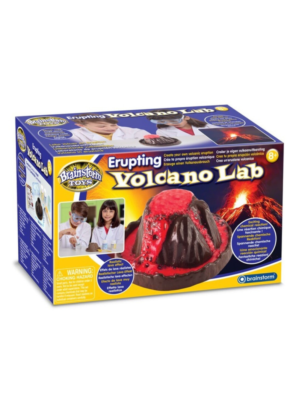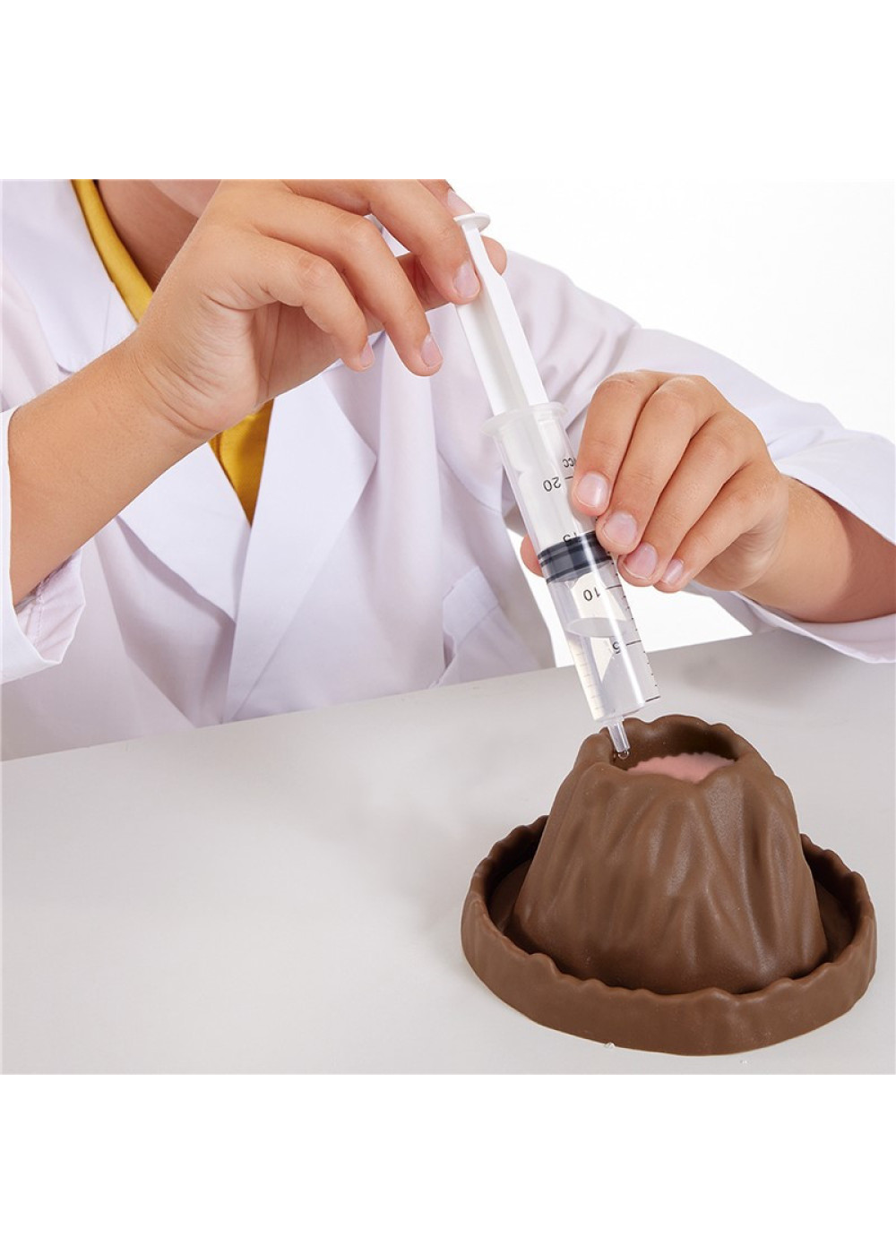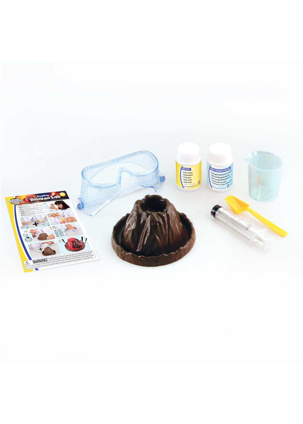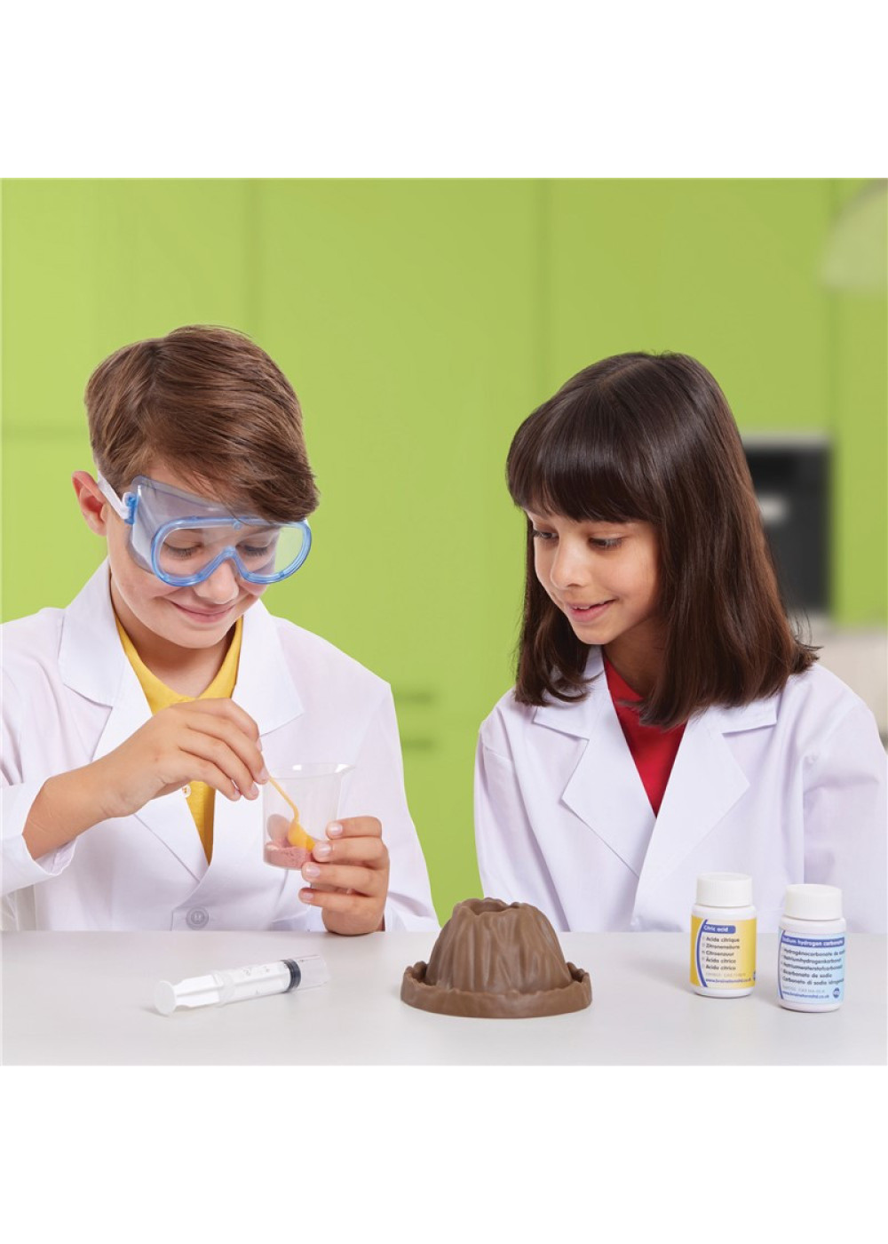 Contiene los químicos para realizar el experimento, base de volcán, gafas de seguridad, vaso medidor, cuchara y jeringa.