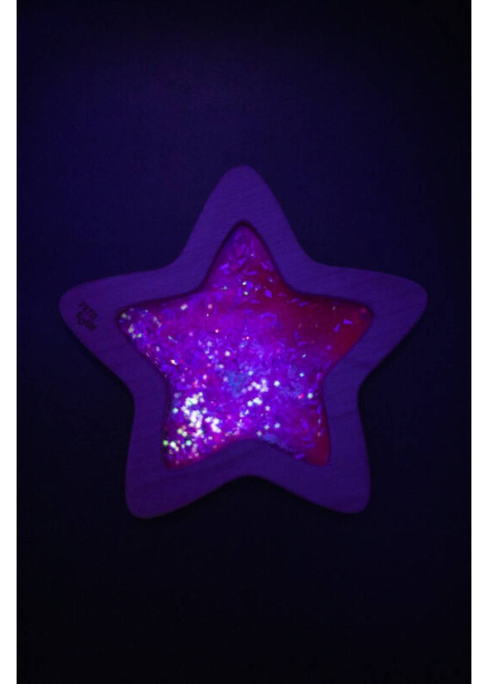 Un pedacito de galaxia en la punta de sus dedos. Toda la magia de nuestras botellas, ahora en forma de estrella, con un marco de madera de haya ideal para las manos de los más pequeños.
