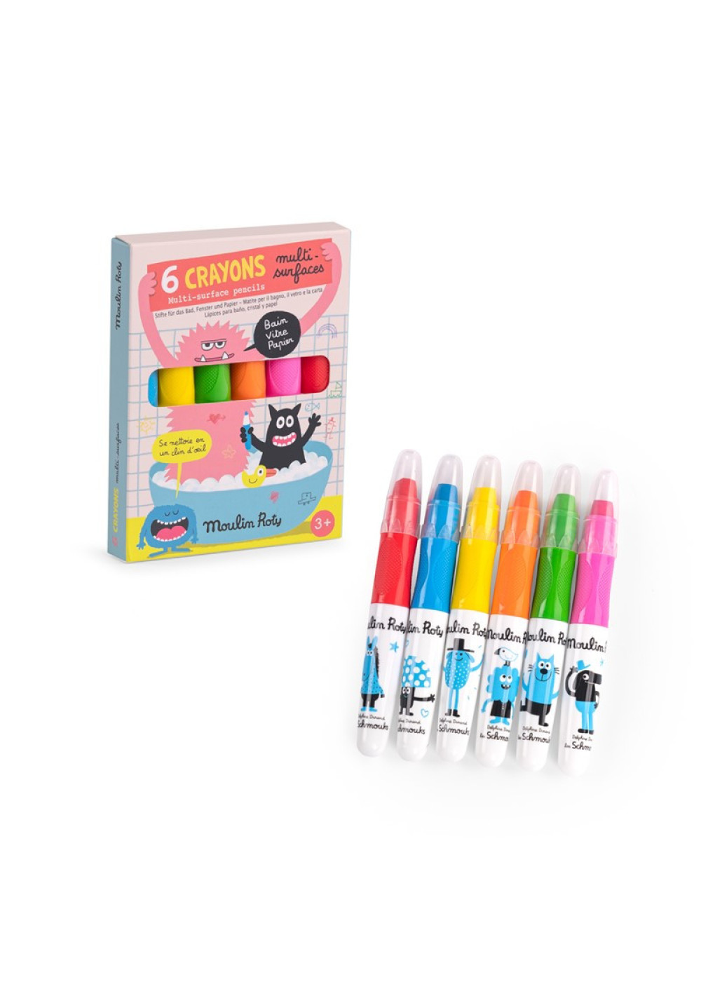 Crayones en colores vibrantes, diseñados para dibujar sobre diversas superficies: cristal, papel y hasta en el baño, con un efecto parecido a la acuarela
