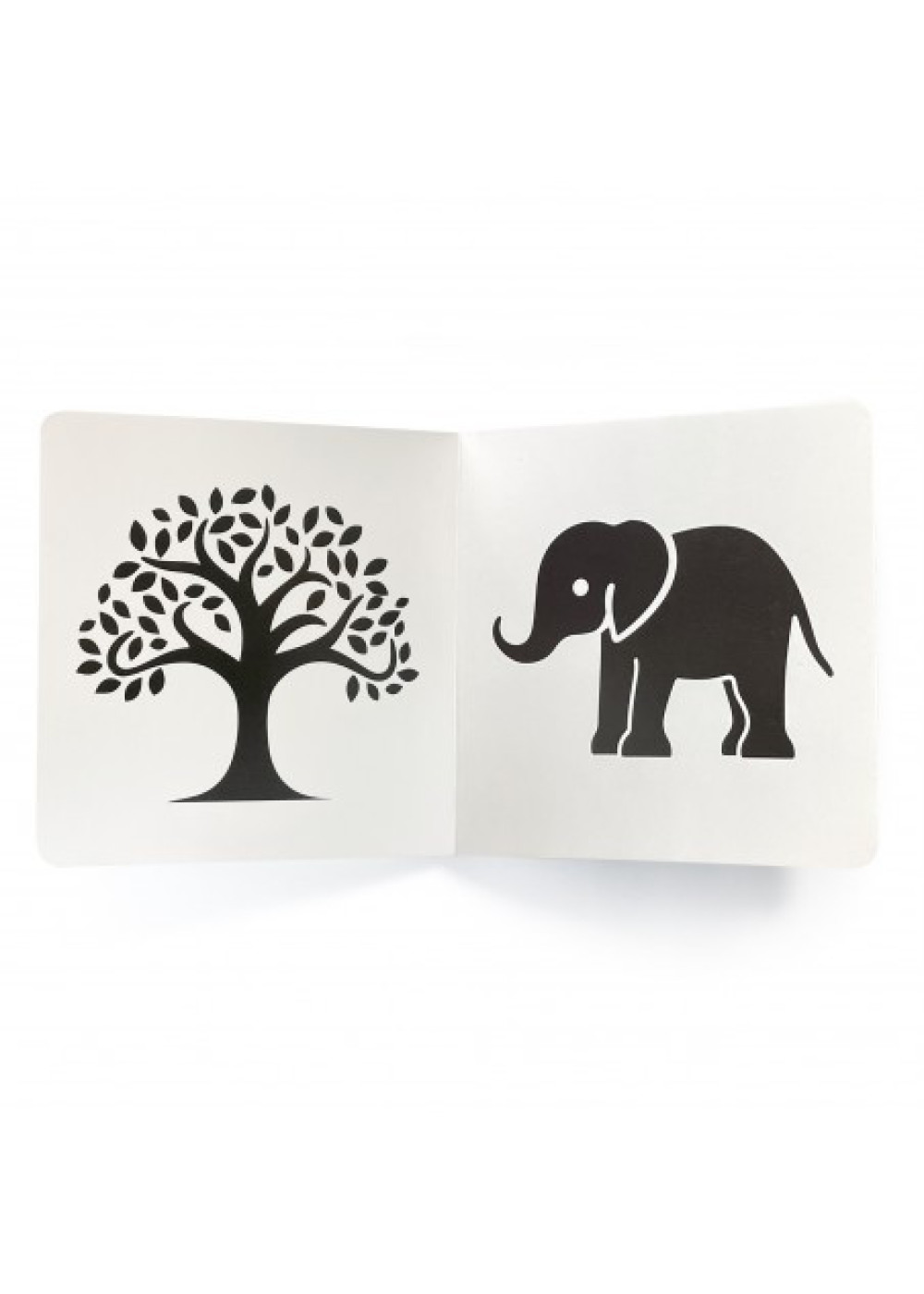 Cada página presenta una única ilustración en negro sólido sobre fondo blanco, logrando el máximo contraste visual.