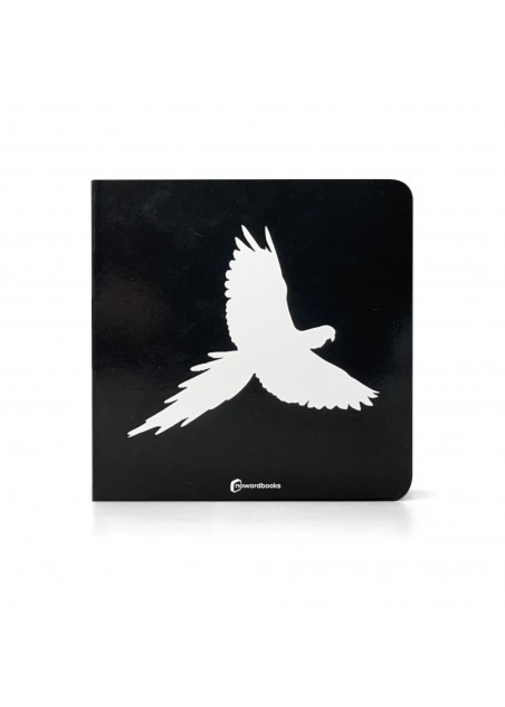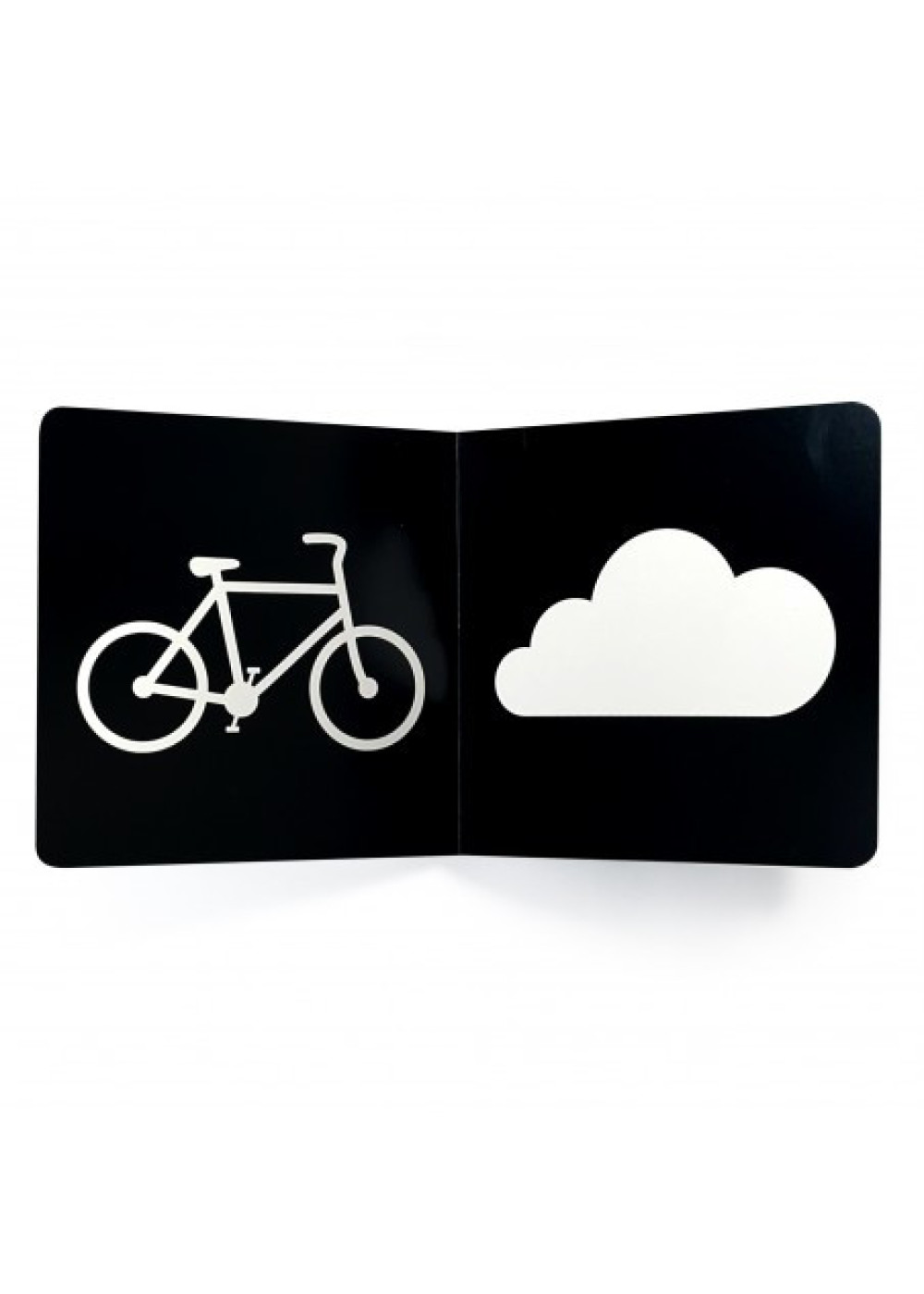Cada página presenta una única ilustración en blanco sólido sobre fondo negro, logrando el máximo contraste visual.