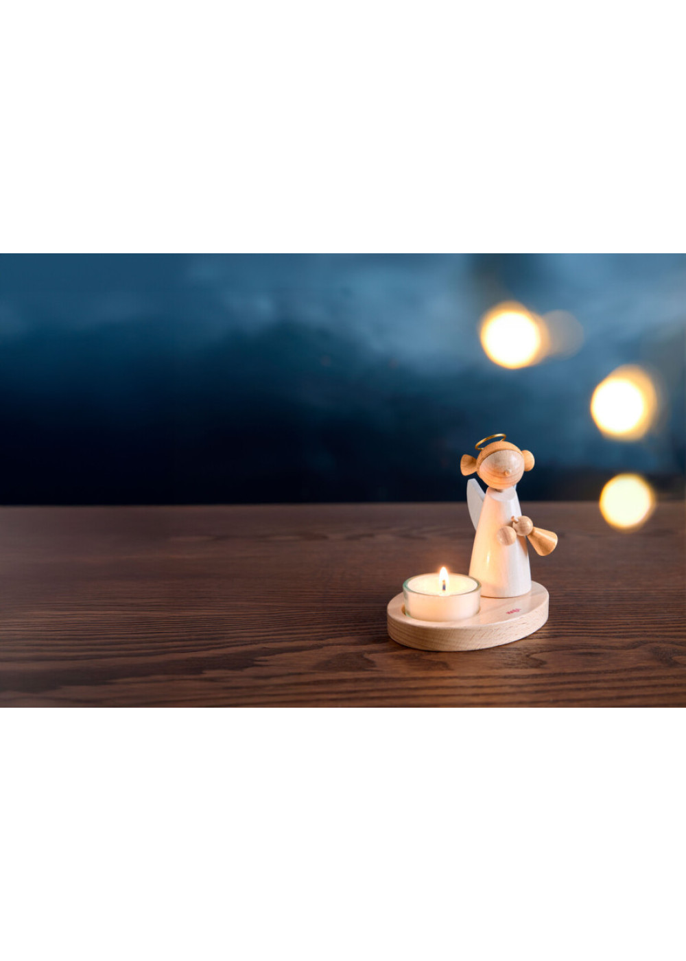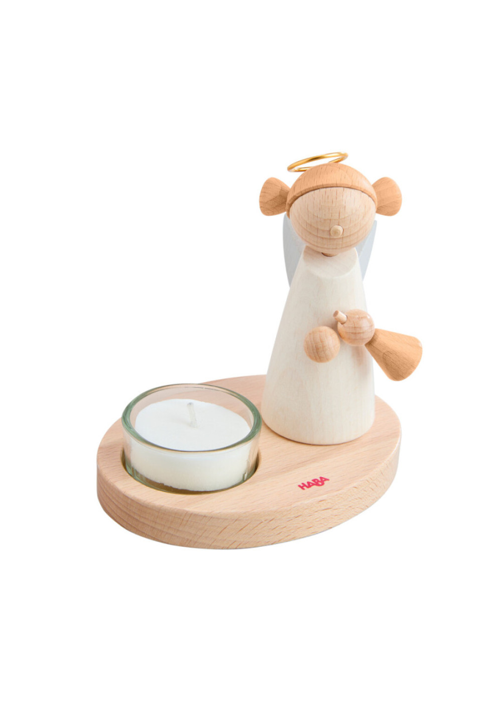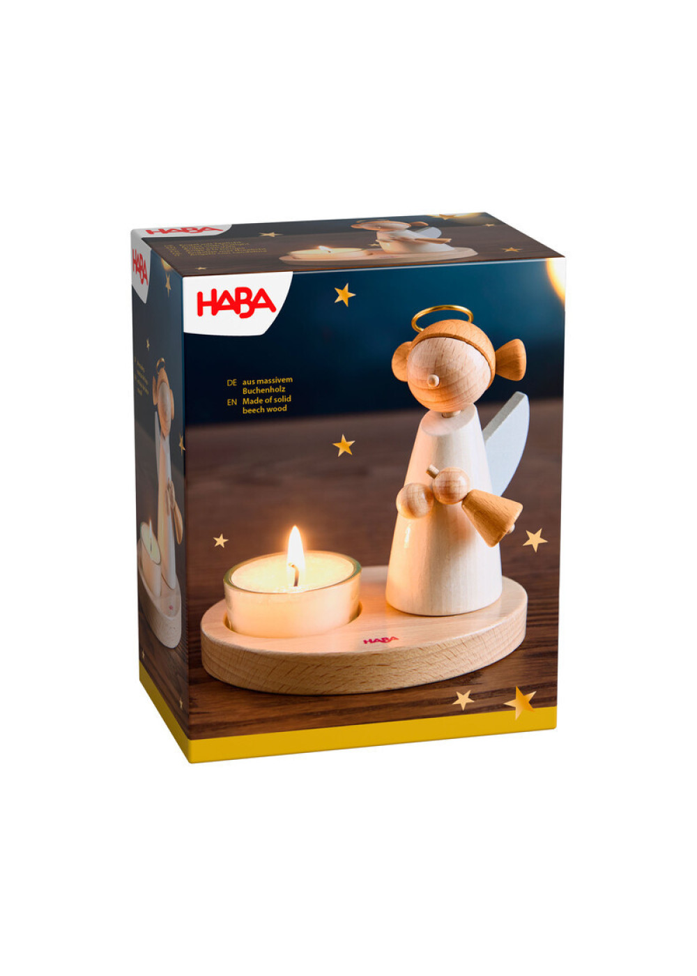 Ángel de madera con el diseño clásico de HABA. Este angelito anuncia la llegada de la Navidad con el sonido de su campanita. Para crear una atmósfera de serenidad, se puede encender una vela en el portavelas de la base. La elegante madera de haya en tonos