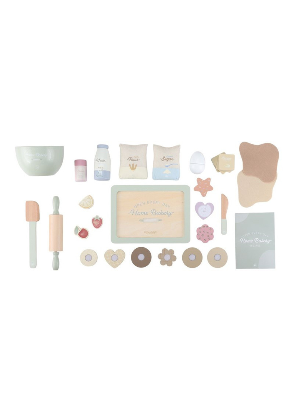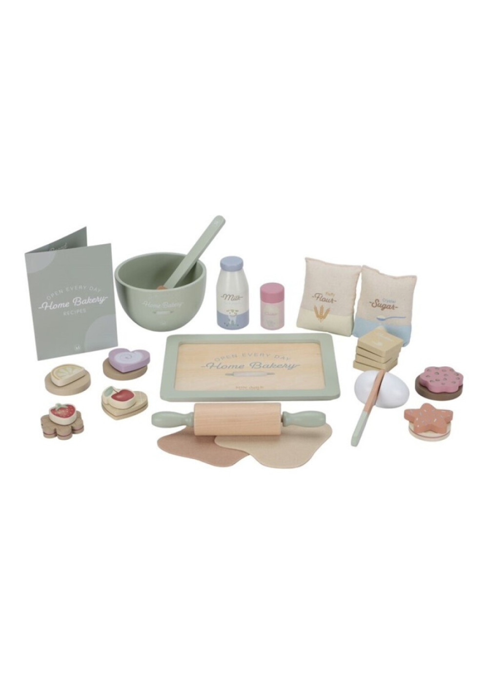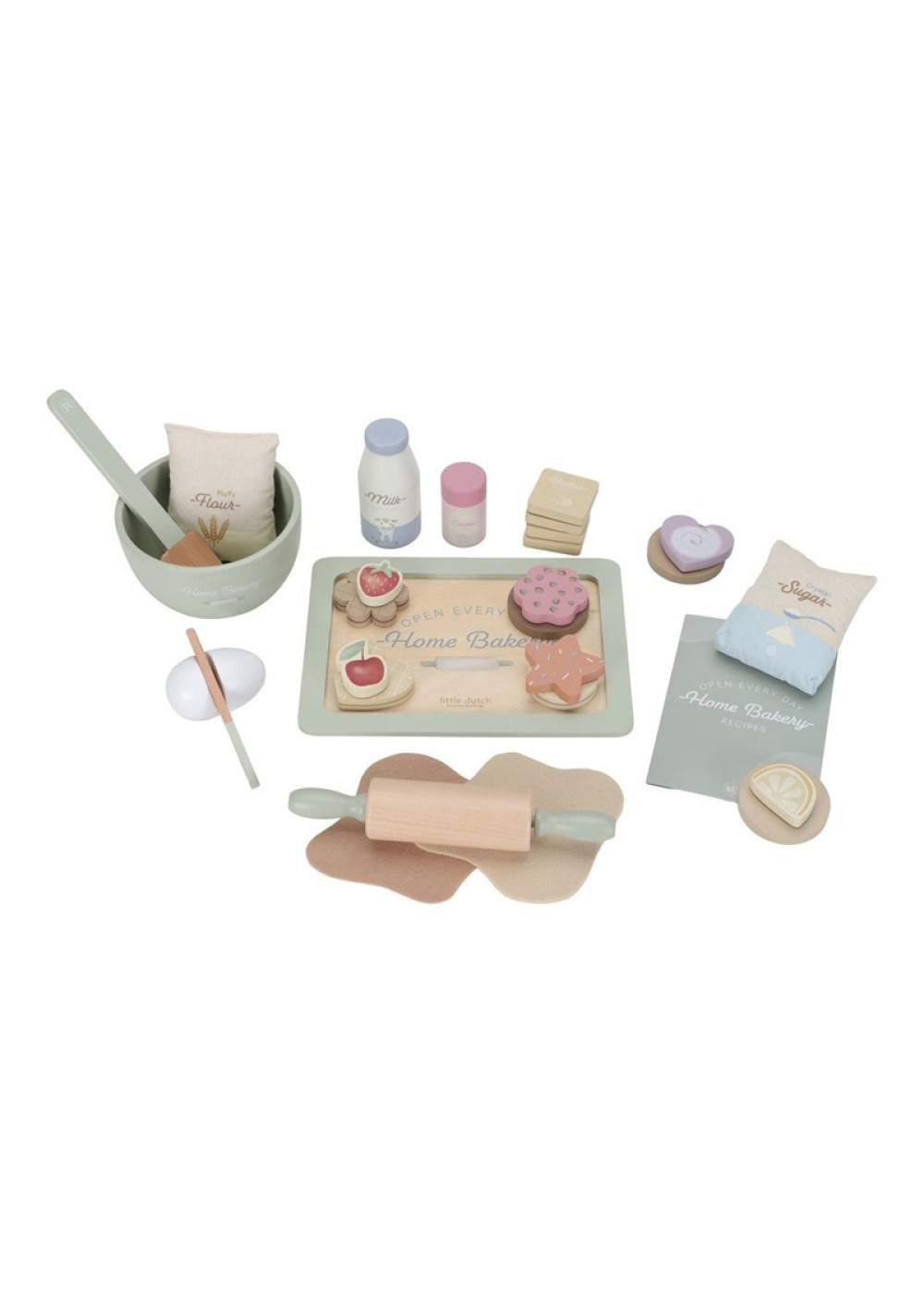 ¡Hora de hornear algo delicioso! Con este set de repostería de madera, los pequeños pasteleros pueden aprender a preparar deliciosas galletas y pasteles. El set incluye una tarjeta con la receta y todos los ingredientes esenciales, como un bol, una bandeja para hornear con galletas, ingredientes, un huevo, mantequilla, harina, azúcar, leche e incluso chispas de colores. Extiende la masa de fieltro con el rodillo y decora las galletas a tu gusto. ¡El set perfecto para divertirse sin límites en la cocina de juguete!