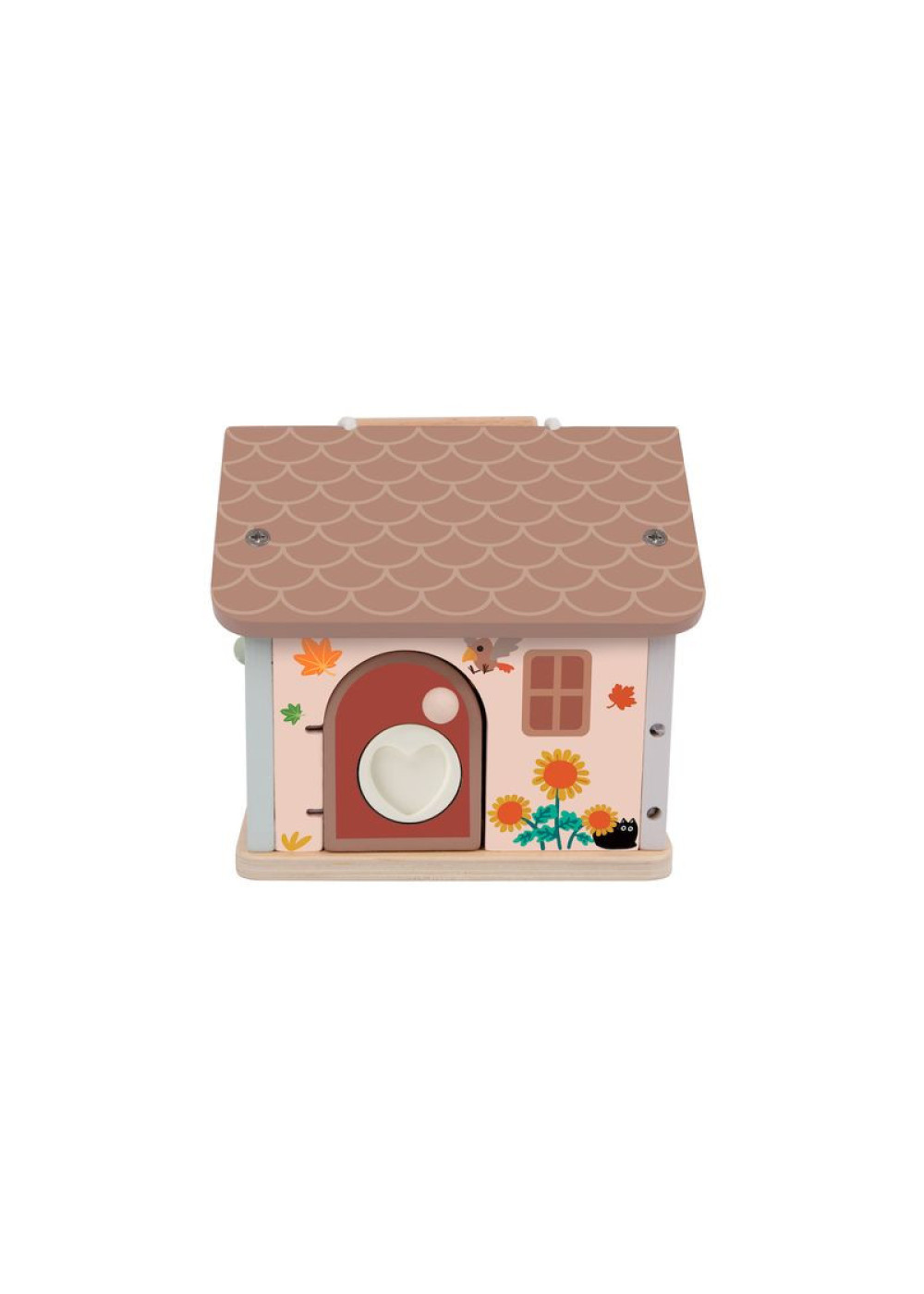 Este juguete de cerraduras y llaves tiene forma de casa y presenta varios personajes, así como un gatito y un pastel de cumpleaños.