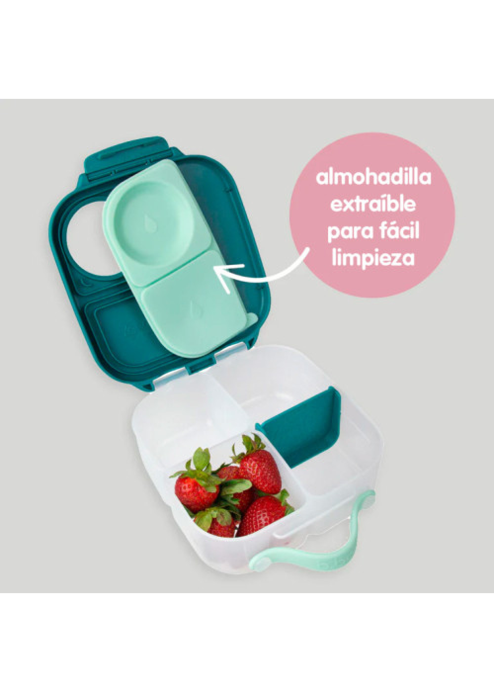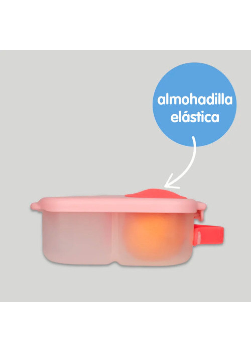 - 2 compartimentos con almohadilla de silicona flexible a prueba de fugas que protegen los alimentos semilíquidos, como la sandía y el yogur (no líquidos). La almohadilla es extraíble para una limpieza fácil e higiénica. Para conservar la funcionalidad a prueba de fugas, no se recomienda lavar en lavavajillas.