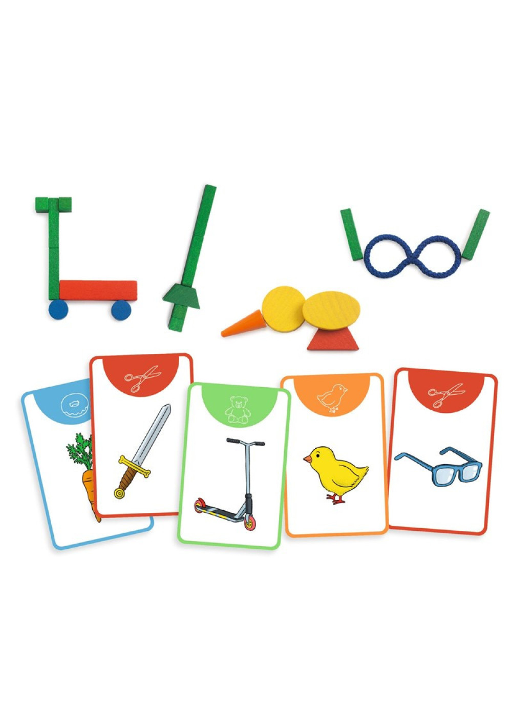 Representar objetos, animales, plantas, juguetes, etc. usando formas de maderay un cordon.Favorece la exprecion y la comunicacion visual.