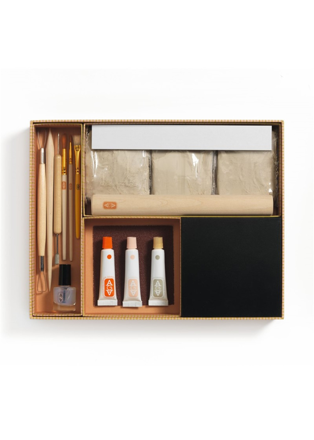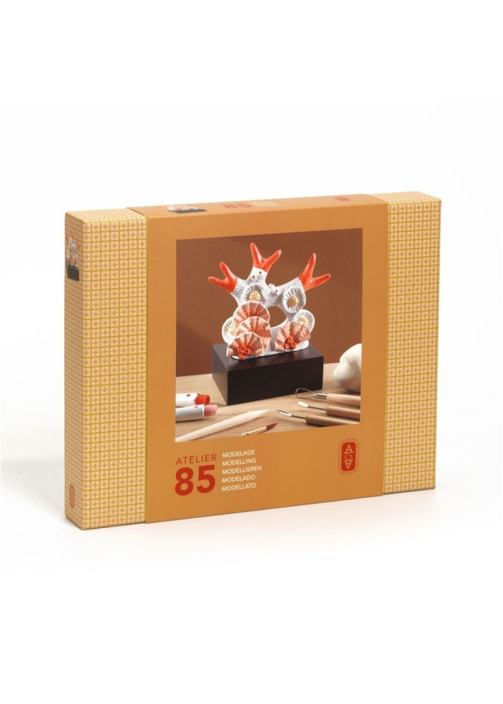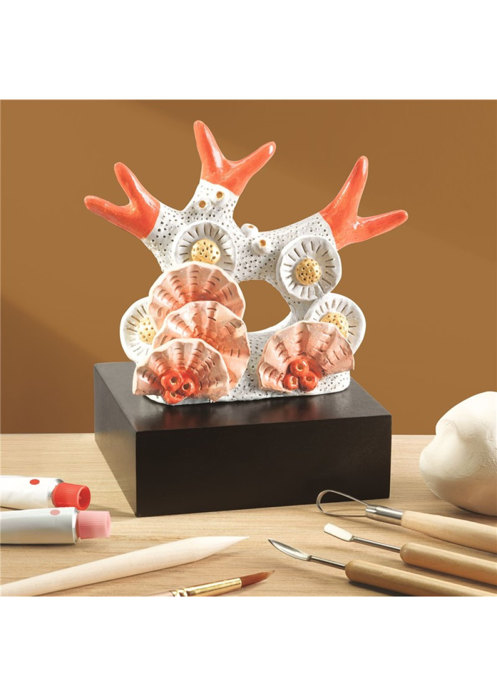 Contenido: 3 x 250 g de arcilla, 5 herramientas, 1 tablero de modelo para entender las dimensiones, 1 soporte de trabajo de madera, 2 pinceles, 3 x 10 ml de pintura, 1 x 10 ml de barniz, 1 soporte de presentación pintado de madera, 1 modelo a seguir, 1 folleto y 1 tarjeta con código QR para acceder al tutorial en vídeo.