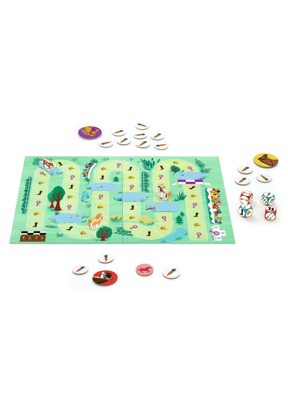 En este juego, cada jugador monta un caballo y, a lo largo de la pista, deberá decidir en cada turno si «trotar» o «galopar».