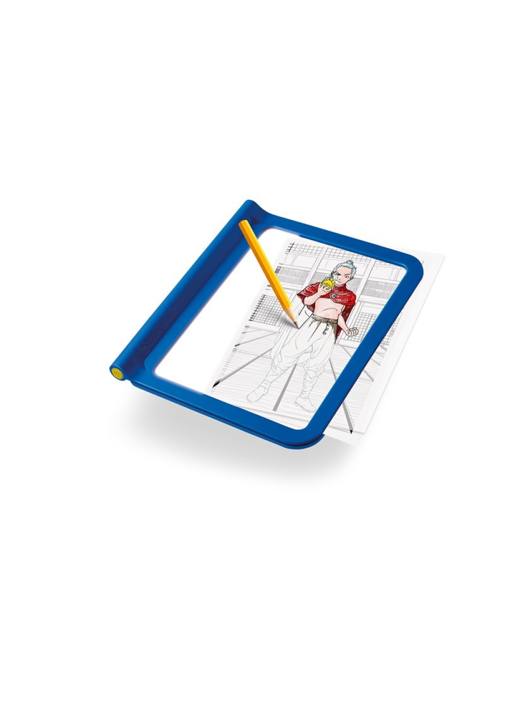Tu hijo podrá reproducir o calcar fielmente letras, números o dibujos existentes. De doble cara, la parte posterior también funciona como una tableta de dibujo negra con un efecto neón que resalta los colores del dibujo durante la noche.