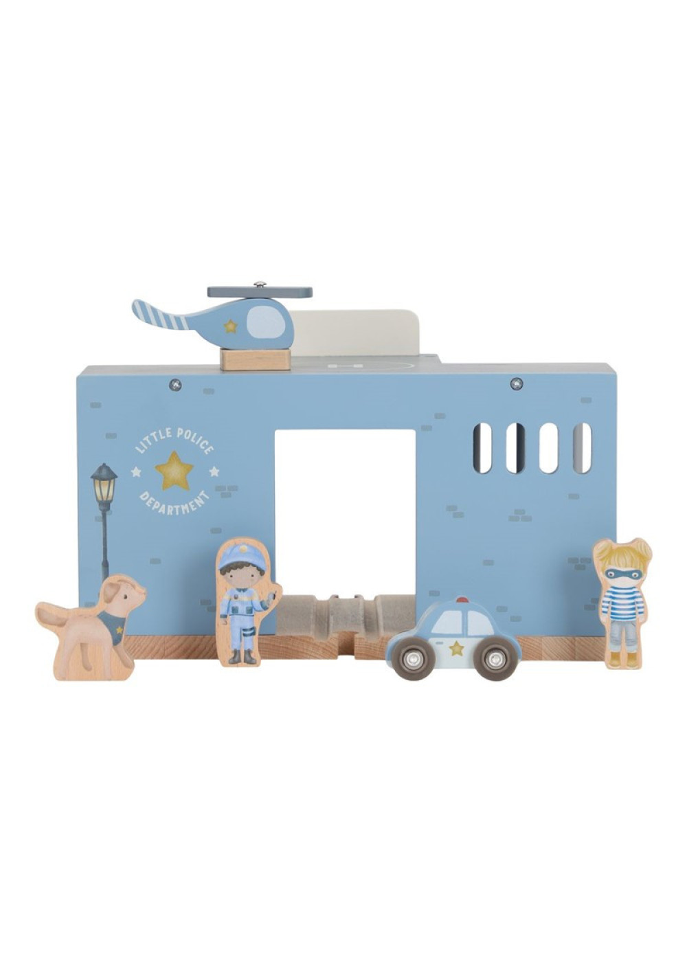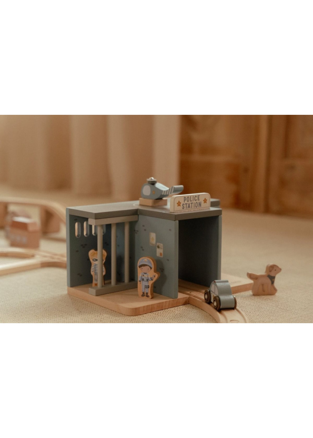 ¡Ladrón descubierto! Esta comisaría de madera lo tiene todo para crear emocionantes historias policiales. Incluye un coche patrulla, un helicóptero, un agente, un ladrón e incluso un perro policía. La comisaría cuenta con una celda con barrotes y una plataforma de aterrizaje. Encierra al ladrón y mantén la ciudad a salvo. Este juguete de comisaría es el complemento perfecto para la vía del tren de madera XL y fomenta el juego imaginativo. ¿A quién llevarás a la comisaría?