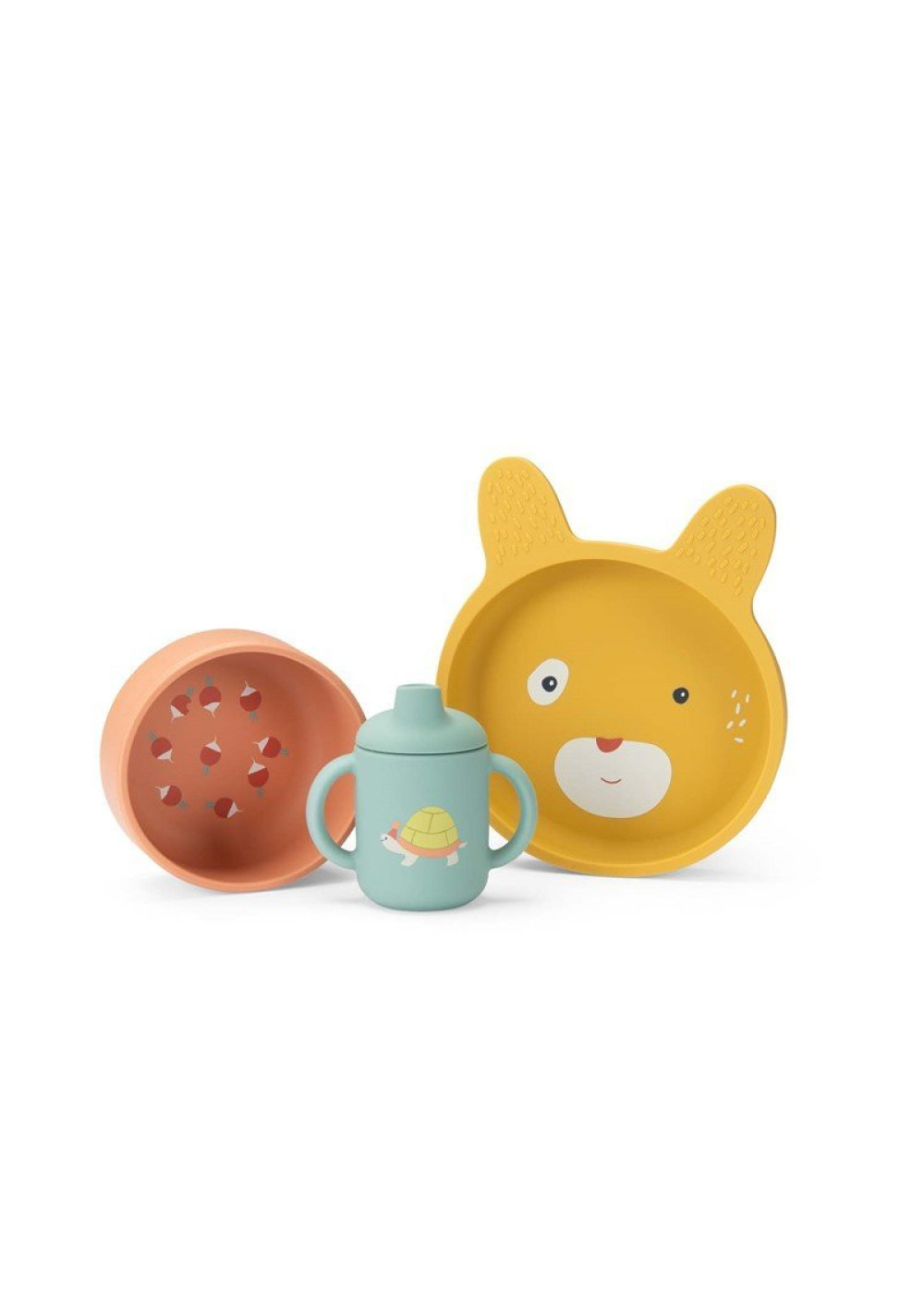 Set de vajilla de silicona que inluye un plato, un cuenco y un vasito de aprendizaje.