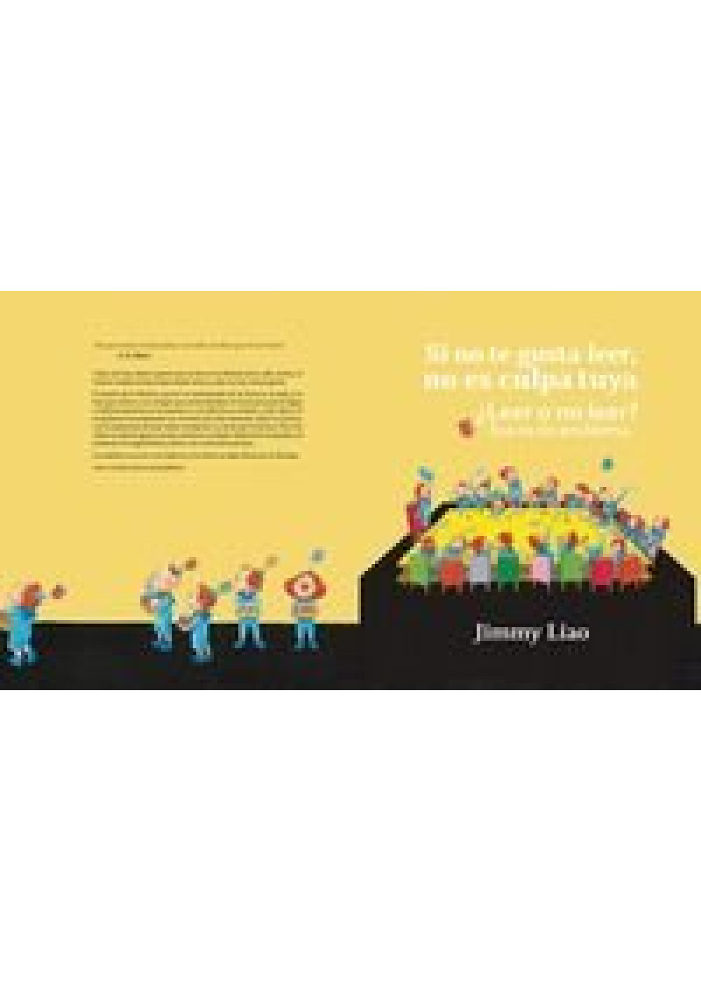 En Si no te gusta leer, no es culpa tuya, Jimmy Liao presenta una aguda e irónica reflexión sobre el cambio que vive el mundo de la literatura: del desamor hacia la lectura al declive de las pequeñas librerías. Un librero corre el riesgo de tener que cerrar su librería. Para entender por qué cada vez menos personas compran y leen libros, le pide a su hijo que reúna a un grupo de amigos para discutir si la belleza de libros y el placer de leer son cosas del pasado. Alrededor de la mesa los niños discuten las citas de personajes famosos sobre la lectura y se desata el debate sobre el eterno dilema: ¿Leer o no leer? ¡Esa es la cuestión! Un homenaje a la literatura y a los libros, con un guiño hacia las editoriales y las personas que trabajan en el mundo de la edición. Una invitación a parar, apartar las distracciones a tu alrededor y meditar sobre lo que aporta (o no) la lectura en tu vida.