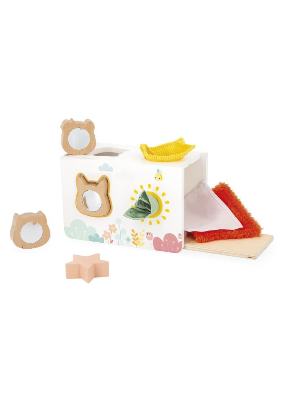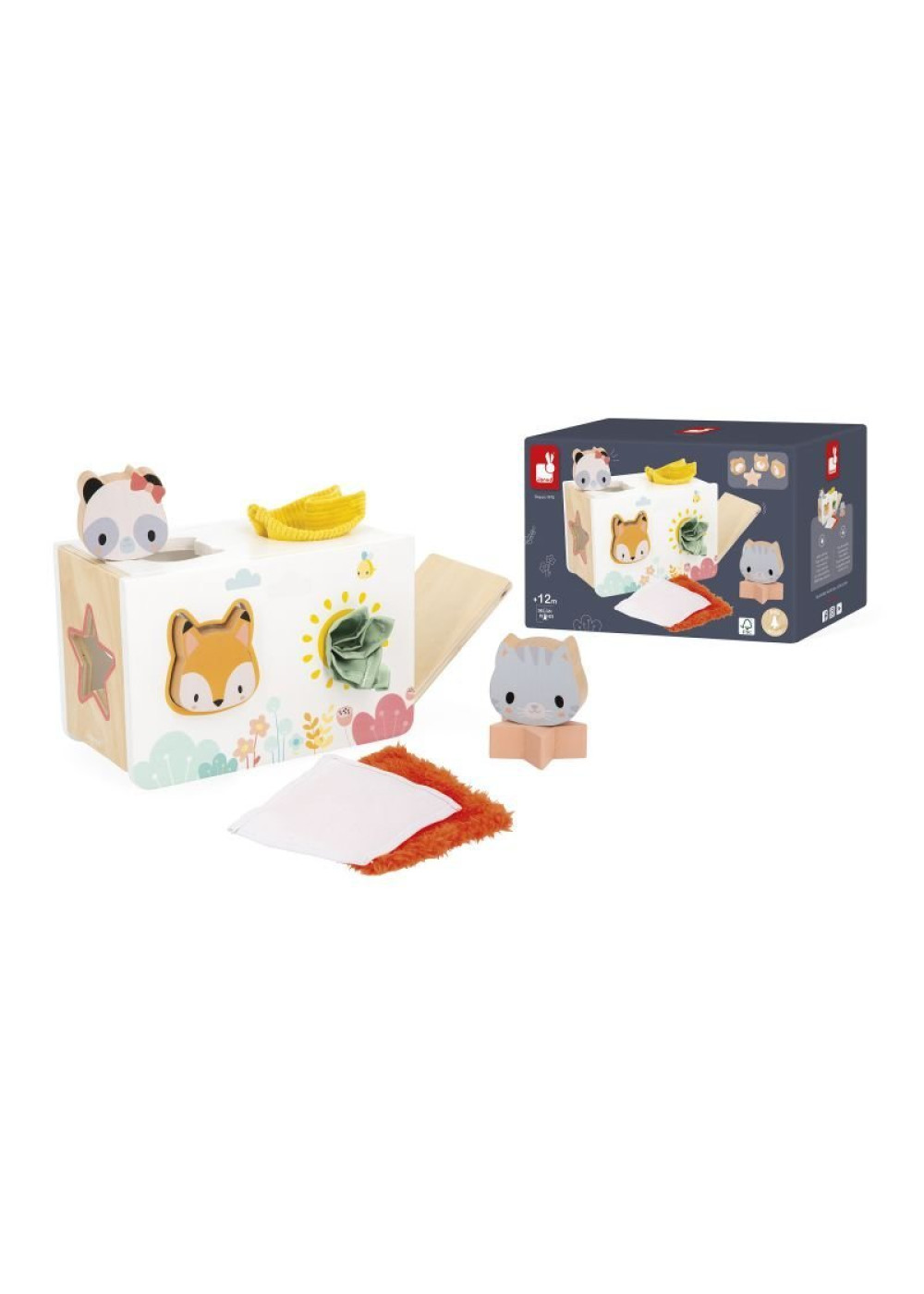 A descubrir formas y texturas con la bonita caja de pañuelos de la gama PURE Janod. Incluye 4 piezas de madera: 3 cabezas de animales (1 panda, 1 gato, 1 zorro) y una estrella, así como 4 «pañuelos» de tejidos con texturas diferentes para descubrir. Las puertas, a los lados, se abren para poder recuperar fácilmente las piezas. Y algo más: detrás de cada cabeza el niño descubrirá un espejo que deforma, muy divertido. Desarrolla la motricidad fina. Juguete de madera FSCTM. Juguete de estimulación para niños a partir de 12 meses.