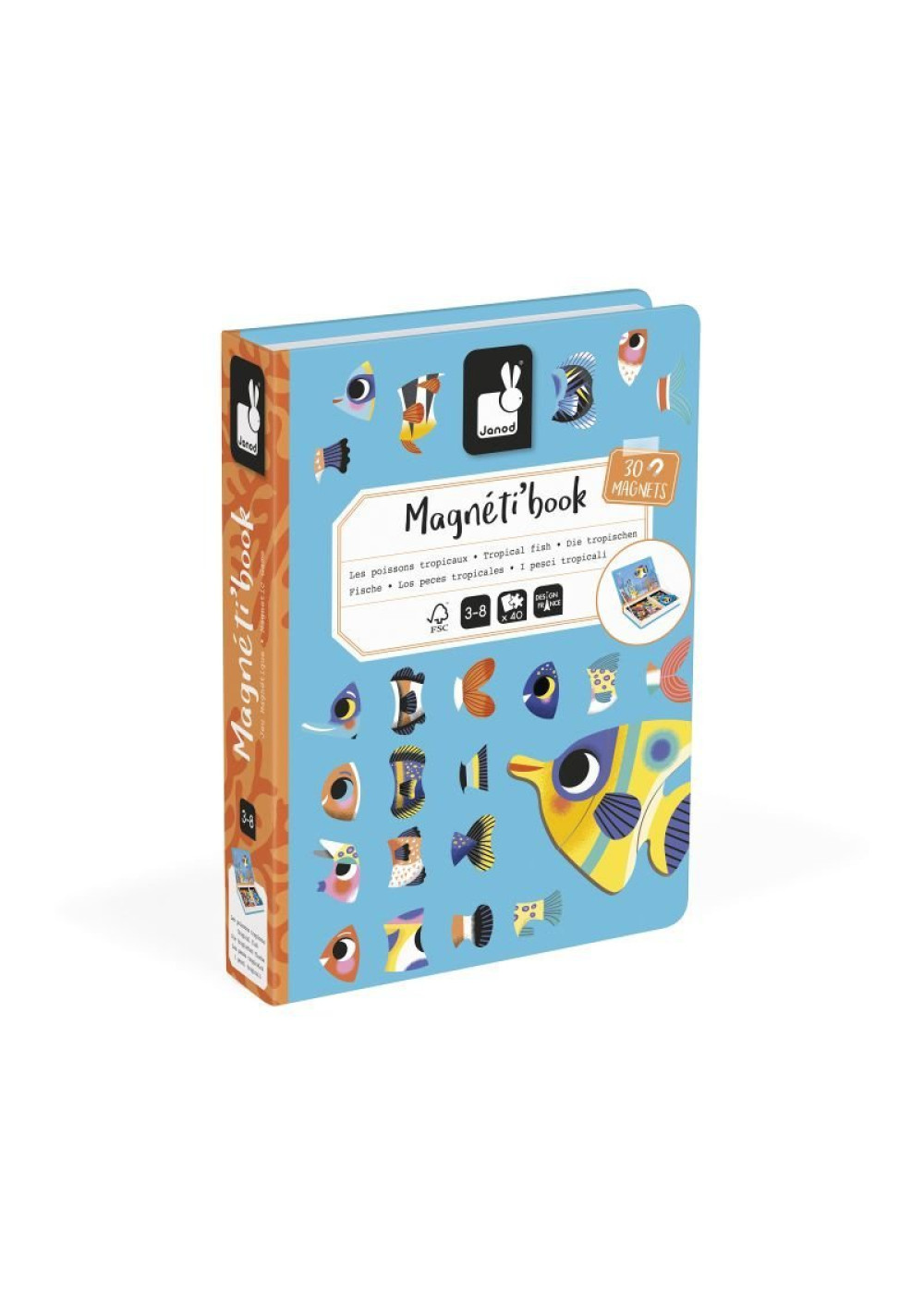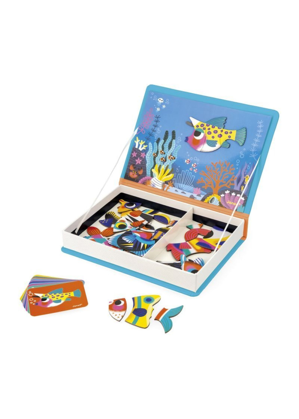 Rosas, azules, verdes... ¡Los hay de todos los colores! ¡Sumérjase para descubrir estos brillantes peces tropicales! Juego magnético compuesto por 30 imanes y 10 tarjetas. El objetivo del juego es reproducir los peces en la escena magnética siguiendo los modelos de las tarjetas. ¡De esta forma, su hijo podrá reproducir fantásticos peces de colores! Perfecto para desarrollar su sentido de la observación y la coordinación mano-ojo. Este Magnétibook permite combinar los imanes para dar rienda suelta a la creatividad de su hijo para que cree nuevos peces. Juego educativo magnético de cartón FSCTM para niños a partir de 3 años.